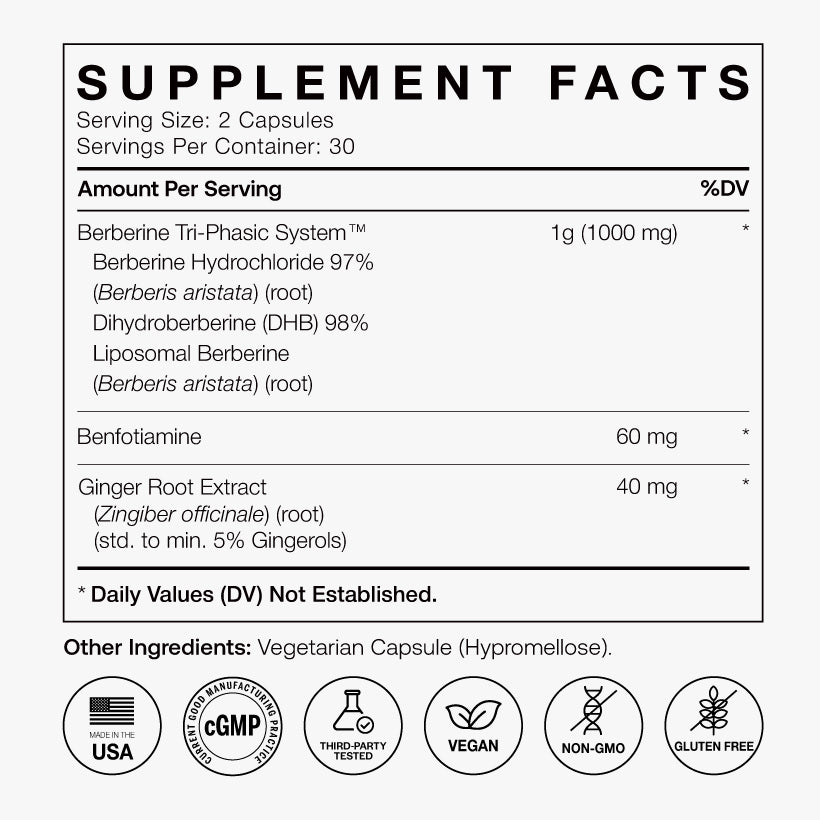 TriPhasic Berberine precisely unites Berberine HCl with Liposomal Berberine and Dihydroberberine ( DHB ) for maximum and sustained bioavailability Optimized with Benfotiamine to support healthy metabolic pathways and promote cellularintegrity. Enhanced with soothing Ginger Extract, the complete formula delivers long-actingmulti-dimensional metabolic support with exceptional comfort.